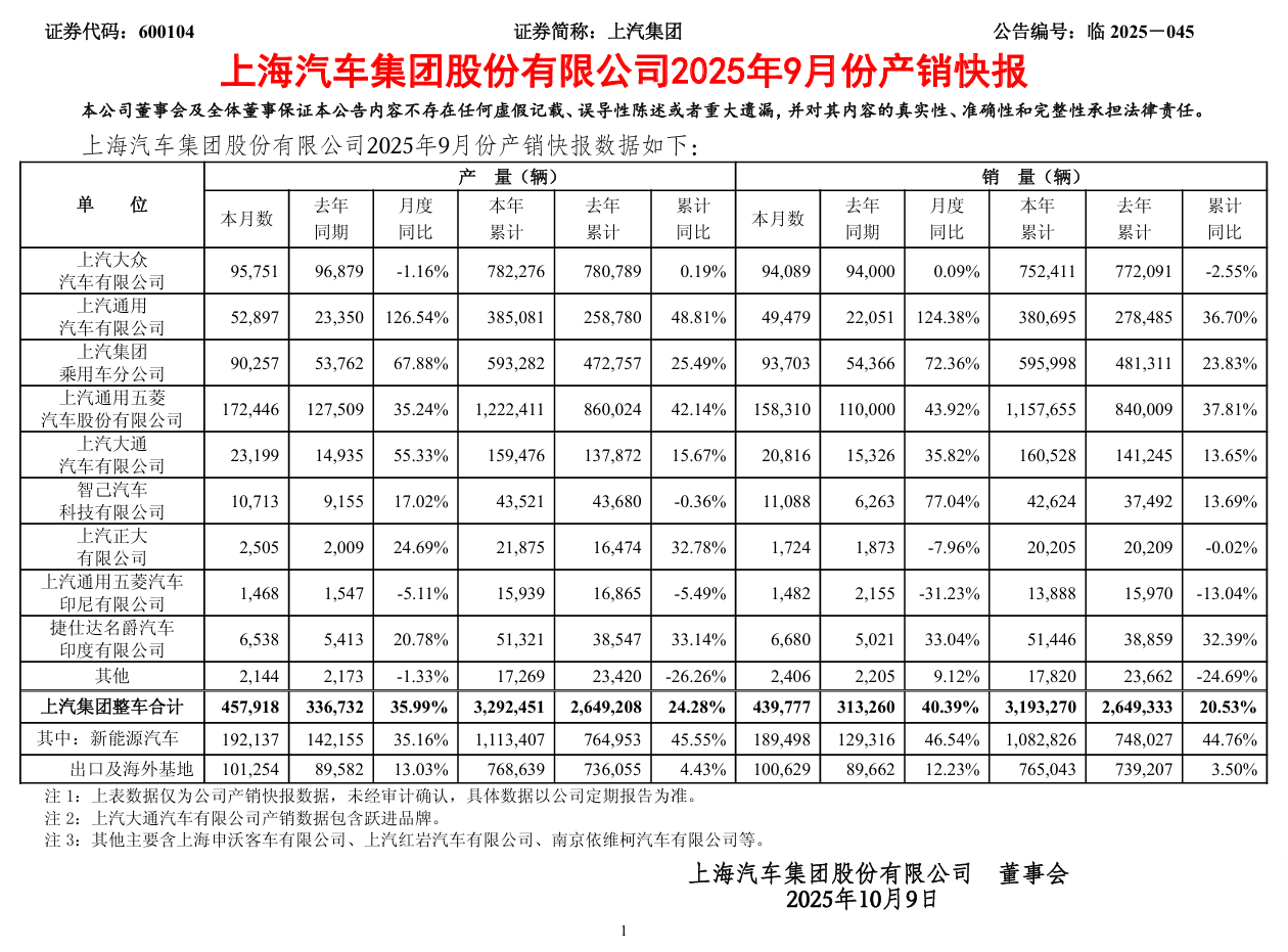上汽集团昨日公布的 10 月产销快报显示,上汽集团 10 月整车合计销量 453978 辆,同比增长 12.96%。其中,新能源汽车 206692 辆,同比增长 31.58%。