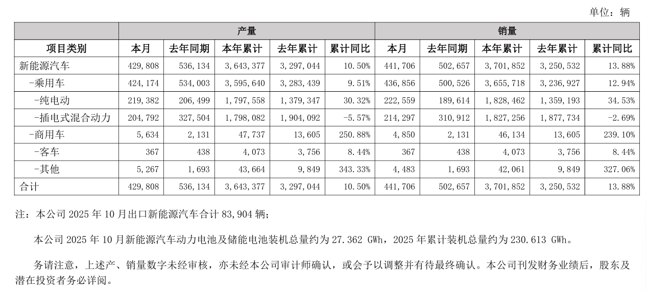 而比亚迪公布的 10 月产销快报显示,汽车 10 月销量 441706 辆,同比下滑 12%。